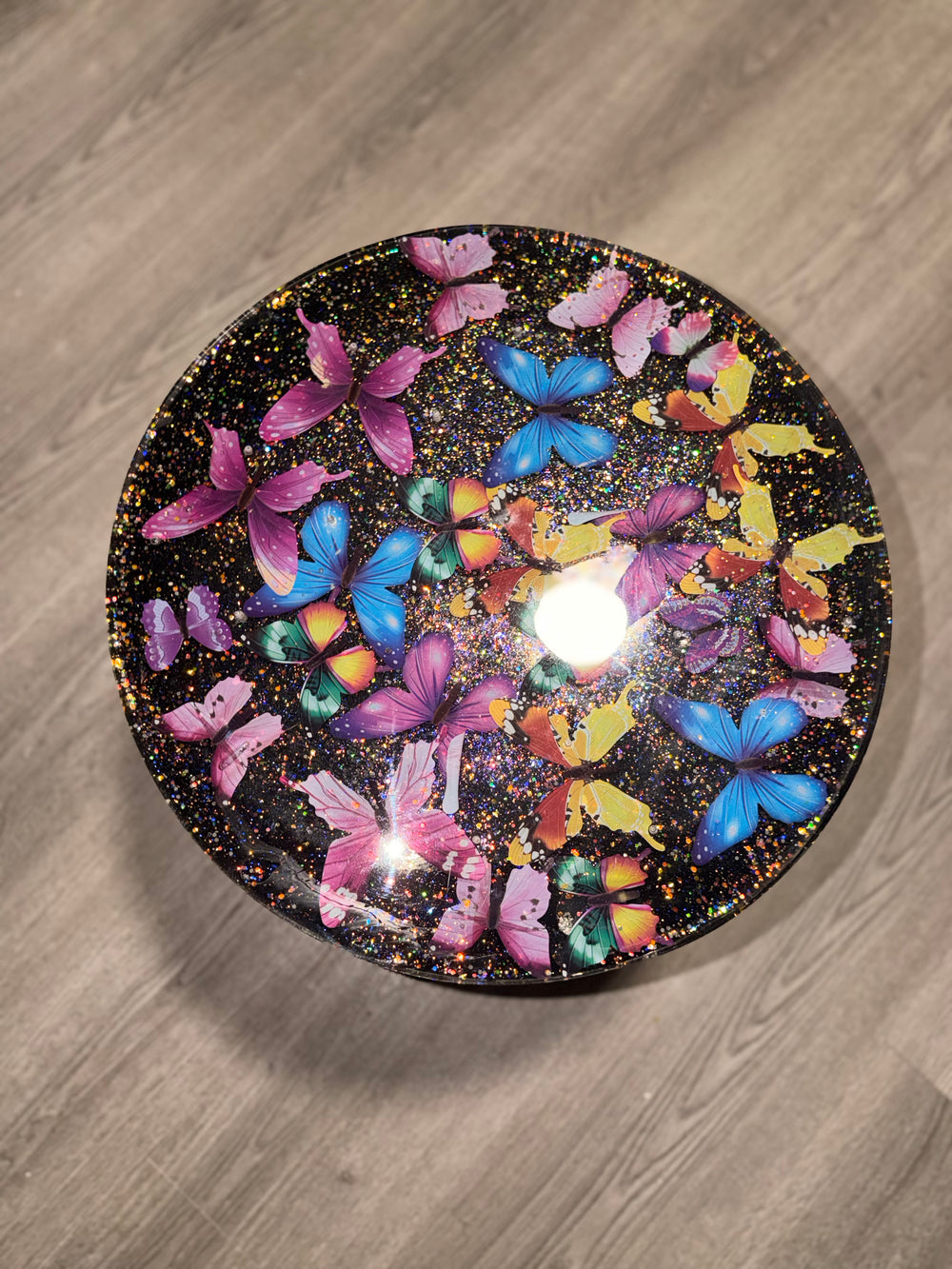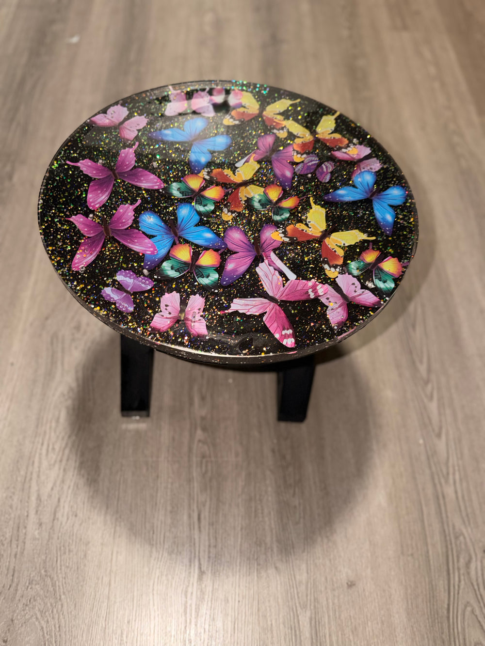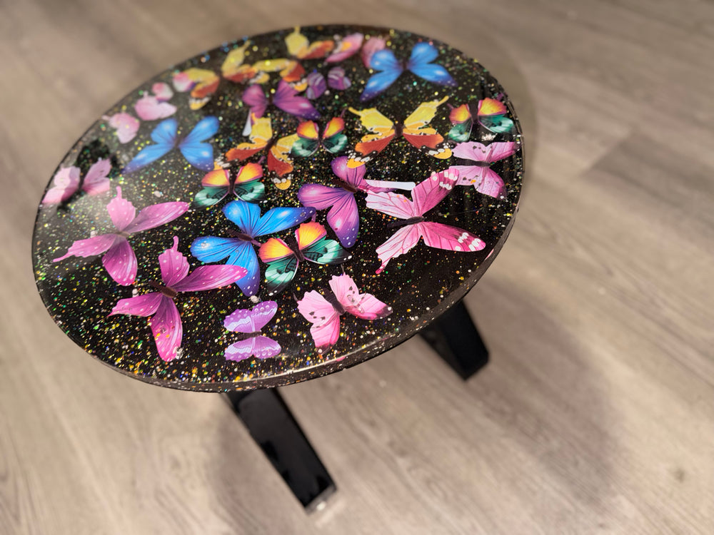 Elevate your space with this handcrafted epoxy resin table, featuring a stunning black butterfly design accented with shimmering glitter.